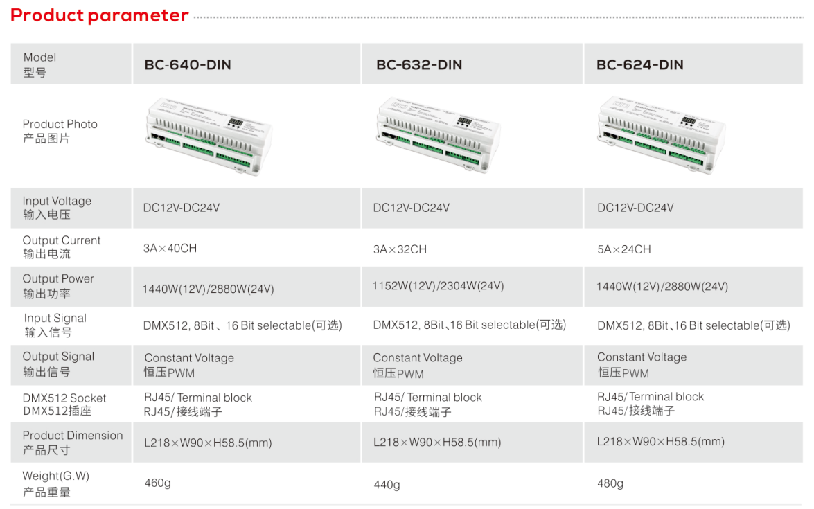 DIN Rail High Power DMX512 Decoder: BC-640-DIN, BC-632-DIN and BC-624-DIN model.