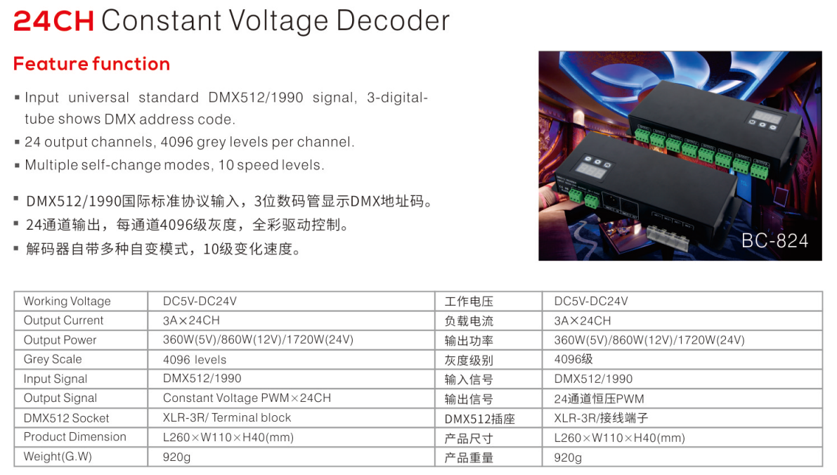 BC-824 24CH constant voltage DMX512 decoder