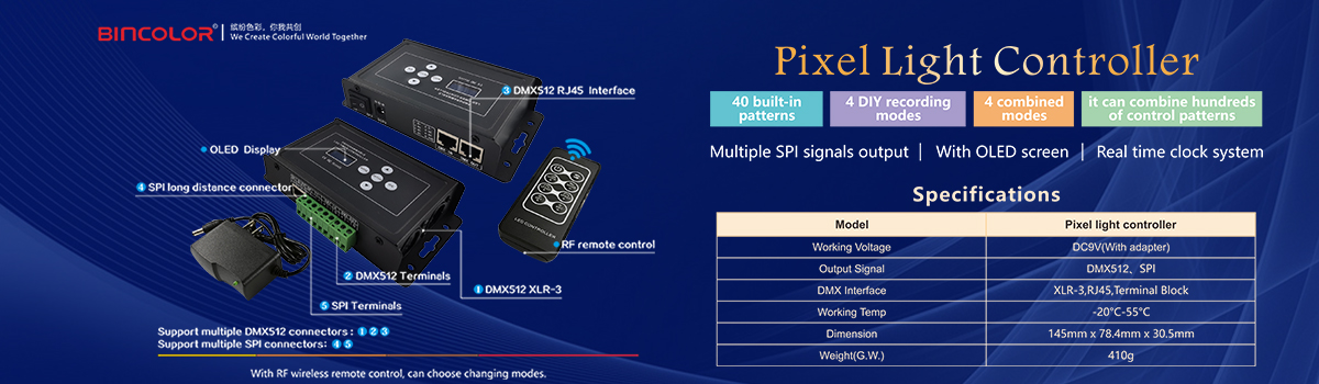 BINCOLOR booth at this year presented several new products——TUYA Wi-Fi smart controller, one input and eight outputs DMX512/RDM signal amplifier, new upgraded BC-100 DMX/SPI pixel light controller and LED power amplifier with constant voltage 48V control etc.