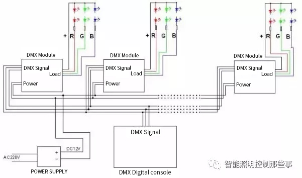 DMX 512 control system: several RGB lamps, each of which contains a DMX module inside. When the module receives power supply and controller signals at the same time, it will drive the LED lamp brightness change, so as to adjust the color change.
