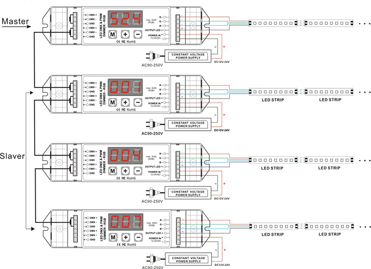 * More than 32 DMX decoders need to be connected with a signal amplifier, the signal amplification can not be more than 5 times.